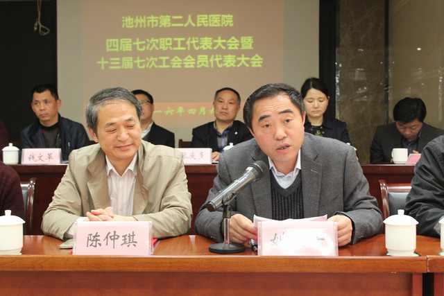 最是一年春好处,春光无限催人进。4月9日上午,池州市第二人民医院四届七次职工代表大会暨十三届七次工会会员代表大会在秀山国际大酒店六楼会议室隆重召开。区卫计委副书记姚国平、区总工会副主席王秀娟、区卫生系统工会主席姚林列会祝贺。来自全院各部门职工群体的正式代表79人,列席人员47人参加了会议,会议由纪委书记陈瑞芳主持。