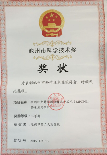 日前,由我院泌尿外科吴江河主任牵头申报的“微创经皮肾穿刺钬激光碎石术”,荣获池州市第七届科技进步三等奖。此次取得的成绩,充分的显示了我院泌尿外科、在微创手术方面的不断创新和进步,对提升我院整体医疗水平具有重要意义。