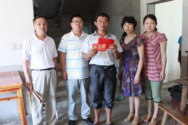 盛夏时节,骄阳似火。为深入落实医院党委与梅村镇檀林村党支部的结对共建工作,2014年7月23日上午,我院党委副书记陈瑞芳率党办主任张庆多、党委青年委员吴卫高、内科党支部组委曹敏等同志一行冒着高温酷暑前往檀林村,在该村党支部书记张全旺同志陪同下,走访慰问了毛坦村民组特困户方重红,并送去慰问金共3000元。