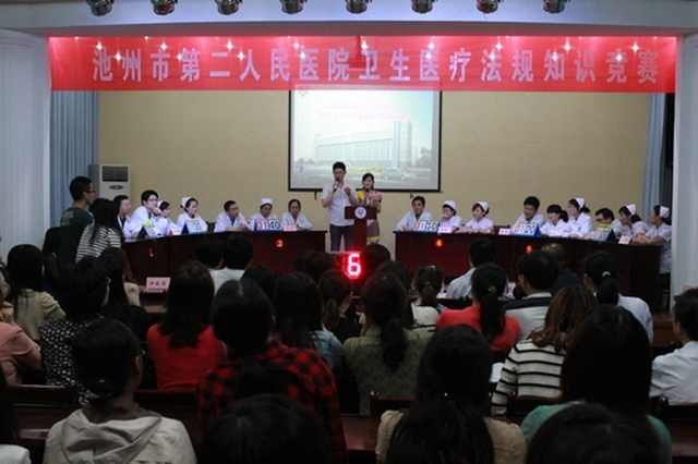 | 5月4日晚7点,医院门诊四楼会议室灯火通明,“池州市第二人民医院卫生医疗法规知识竞赛”正在这里激烈举行。本次比赛全院职工踊跃报名,积极参与。最终,ICU、外科、影像科等6支代表队通过预赛角逐进入决赛。医院俞燕生院长,陈瑞芳、汪国平副院长,朱海清主席出席了本次比赛。贵池区消防大队部分官兵作为特邀嘉宾全程观摩了比赛,并参与了现场互动环节。 比赛共分为三个环节:必答题、抢答题和风险题三种题型,ICU的三名参赛选手在赛前的认真准备下,默契合作,经过激烈角逐,最终获得第一名。