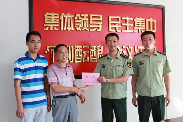 7月31日上午,我院党办主任张庆多、保卫科科长陈新建、团委书记朱珲一行3人,在“八一”建军节前夕,带着全院职工对子弟兵的深情厚谊,前往贵池区消防大队,看望慰问消防救援人员,并为他们送去3000元慰问金。