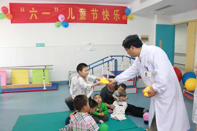 6月1日上午,我院康复医学中心康复治疗师们与8位脑瘫患儿欢聚一堂,治疗师与孩子家长一起,为孩子讲故事,与他们做游戏并赠送了节日礼物,共度“六·一”国际儿童节,同享节日的快乐。