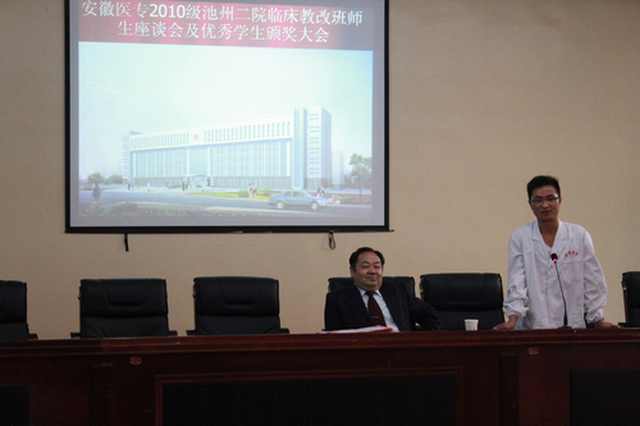安徽医专2010级临床医学专业教改班顺利完成了在池州市第二人民医院的各项学习内容。4月20日,在池州二院四楼会议室举行了该班结业座谈及颁奖典礼。池州市第二人民医院院长俞燕生,副院长陈瑞芳、杨善敏、陈仲琪、工会主席朱海清出席会议,出席会议的还有部分临床授课教师以及10级池州二院教改班全体同学,会议由科教科王文舟科长主持。