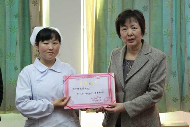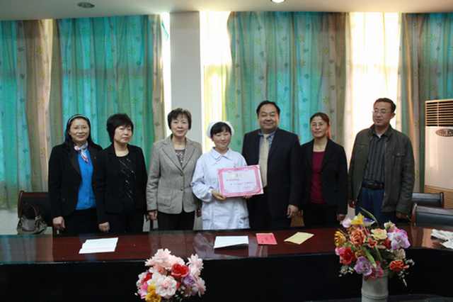 4月16日下午,池州市妇联陶旭临主席一行五人来到我院,为我院勇救心脏骤停老人徐晓霞同志授予“市三八红旗手”荣誉称号,并号召广大妇女同志向徐晓霞同志学习,学习她助人为乐,见义勇为的优秀品质。