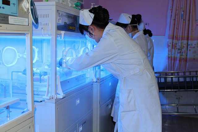 “10月30日7点半,从别院转来只有1.4公斤重的双胞胎,真是让我们忙得不可开交,这两个孩子属于极低体重新生儿,送来时呼吸困难患有呼吸窘迫综合症,无体温并且四肢出现青紫,情况十分危急,医护人员当机立断立刻给患儿气管插管,做好呼吸道管理,为患儿清理皮肤并送进了暖箱,现在双胞胎的生命体征平稳。”新生儿科专科组长杨妩媚说。