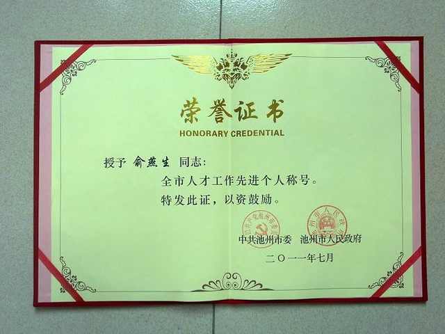 >> 俞燕生院长荣获“全市人才工作先进个人”光荣称号