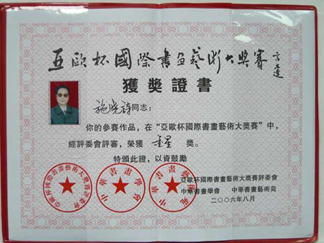 施晓诗,1942年生,副主任医师。 现为中国书画家协会会员、中国老年书画艺术委员会会员、老年教育书画研究院院士、塞北书画院名誉院长等。书画作品入编《中国当代书画家代表作品库》、《中国当代知名书法家墨迹选》、《当代中国杰出书画家精品集》等10余典籍。诗文作品也曾先后在报刊发表30余首。在全国性书画大赛中近20件书画作品获金、银奖。2005年12月出版了《施晓诗诗书画作品集》。
