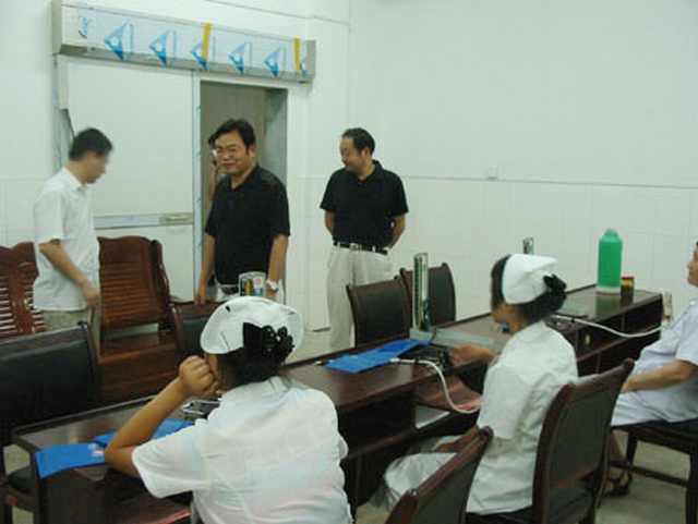 7月6日,市劳动保障局副局长王大虎,市医保中心主任何正坤及区劳动与社会保障局领导姚丽琼、柯天虎前来我院看望我市参加首次居民免费健康体检的居民。