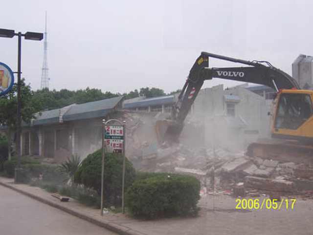 5月17日上午7:30,随着一阵隆隆的机器声,市二院门前的门面房被自行拆除。