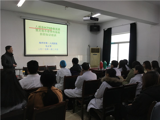 根据贵池区卫计委部署,2017年1月10日,我院医务科、科教科组织开展“人感染H7N9禽流感及其他冬季传染病防治知识”全员培训,培训由感染科主任包文军主讲。 培训中包主任重点讲解了人感染H7N9禽流感和其他冬季传染病的防治知识。通过培训,使我院医务人员熟练掌握了人感染H7N9禽流感和冬季常见传染病的诊疗知识、消毒隔离知识、个人防护知识以及工作流程,对做好人感染H7N9禽流感病例,尤其是重症病例的救治工作起到十分重要的作用。