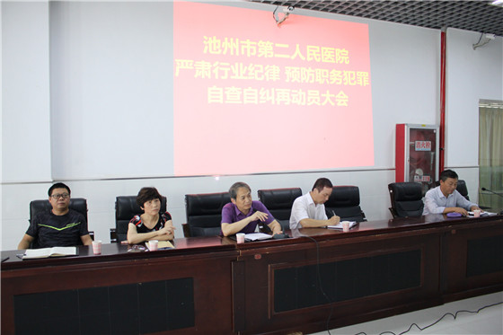 根据池州市第二人民医院“预防职务犯罪专项活动工作方案”,我院预防职务犯罪活动已进入“全面对照检查,认真自查自纠”阶段。8月25日下午,我院召开“严肃行业纪律预防职务犯罪”自查自纠再动员大会,院领导班子成员、职能科长、科主任、护士长、主治医师及以上人员参加了会议,会议由院长陈仲琪主持。
