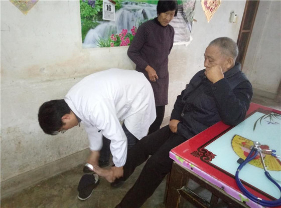 2017年11月16日上午,我院神经内科专家陶四明医生到牛头山木闸卫生院坐诊。因木闸居委会八组的吴姓患者脑卒中四年,且因年龄大,行动不便,故陶医生在乡镇卫生院及村卫生室相关人员的陪同下亲自到患者家中给予诊治。陶医生通过与患者的交流及检查,对患者目前服用药品予以调整使用,并指导患者家属科学及有计划地给患者进行康复训练提高其生命质量。通过此次会诊,既给乡镇卫生院及村卫生室上了一堂生动的培训课,又让患者及家属感受到“县乡村”三级联动的医疗服务。