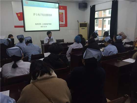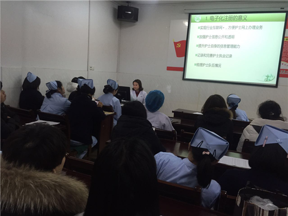 培训会上,杨丽萍主任对《贵池区医疗机构、医师、护士电子化注册管理改革工作实施方案》和《关于开展池州市医疗机构医师护士电子化注册工作的通知》进行了解读,重点介绍了护士电子化注册的意义与重要性,要求各科室高度重视此项工作,会后要在科内开展培训落实;随后吕芬芳副主任对护士电子化注册的流程及操作方法等进行详细的解读,并针对注册过程中出现的常见问题进行重点讲解,为我院全面实施完成护士电子化注册打下了良好的基础。