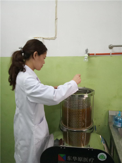新引进的煎药机为常压式煎药机,常压煎煮,保留传统煎药特点,不破坏药材结构,煎出率高;所有接触药品部位均采用安全无毒、耐腐蚀、不吸附的稳定材料;煎药机煎好药后,一包一包分包好,当天下午可取回煎好的汤剂,患者整个疗程可一次性带回家,包装好,携带服用方便。
