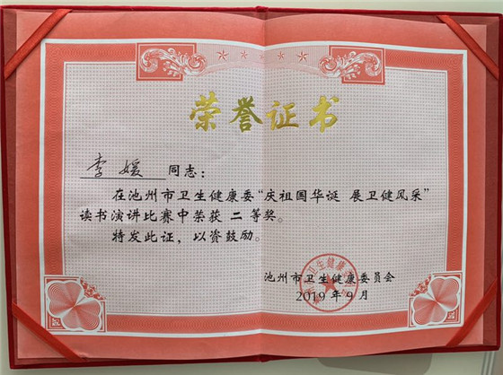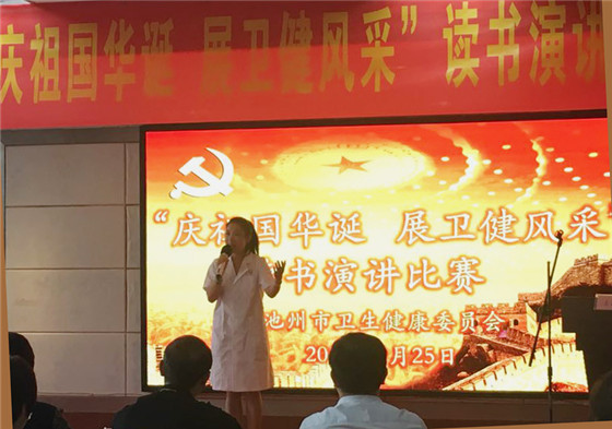 9月25日上午,由池州市卫健委主办的“庆祖国华诞展卫健风采”读书演讲比赛顺利举行,我院选派总务科李媛、外科陈诚两名选手参加了比赛。经过激烈角逐,我院总务科李媛演讲的《樟树礼赞》,声情并茂,脱颖而出,获得评委一致认可,最终荣获二等奖。