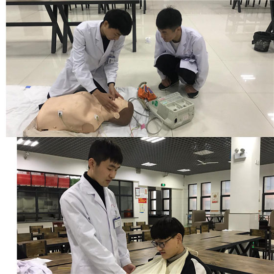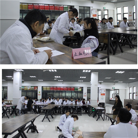 “心肺复苏+电除颤”和”止血包扎”两项技能考核同时进行中