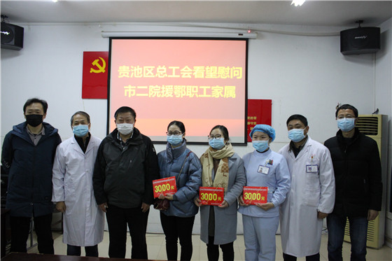 2020218日上午,贵池区总工会张国政书记、张华副主席一行三人来我院看望慰问张兆君、疏海东、洪鹏翔三名援鄂医护人员家属。张国政书记向她们送去了慰问金,表达了工会组织对职工的关心,并对她们舍小家为大家,全力支持疫情防控工作的精神致以崇高的敬意。