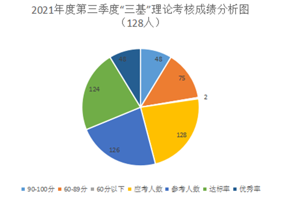 本次“三基”考试内容为各专业基础理论知识,共100道单项选择题,及格分为60分,考试达标率97%,优秀率达38%(≥90分)。(附成绩分析图)