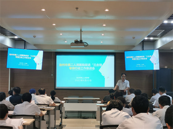 6月12日下午,我院召开“三合理”专项行动工作推进会,医务科、药剂科、三甲办、各科室主任及住院总参会,党委副书记、副院长(主持工作)朱珲出席了会议。