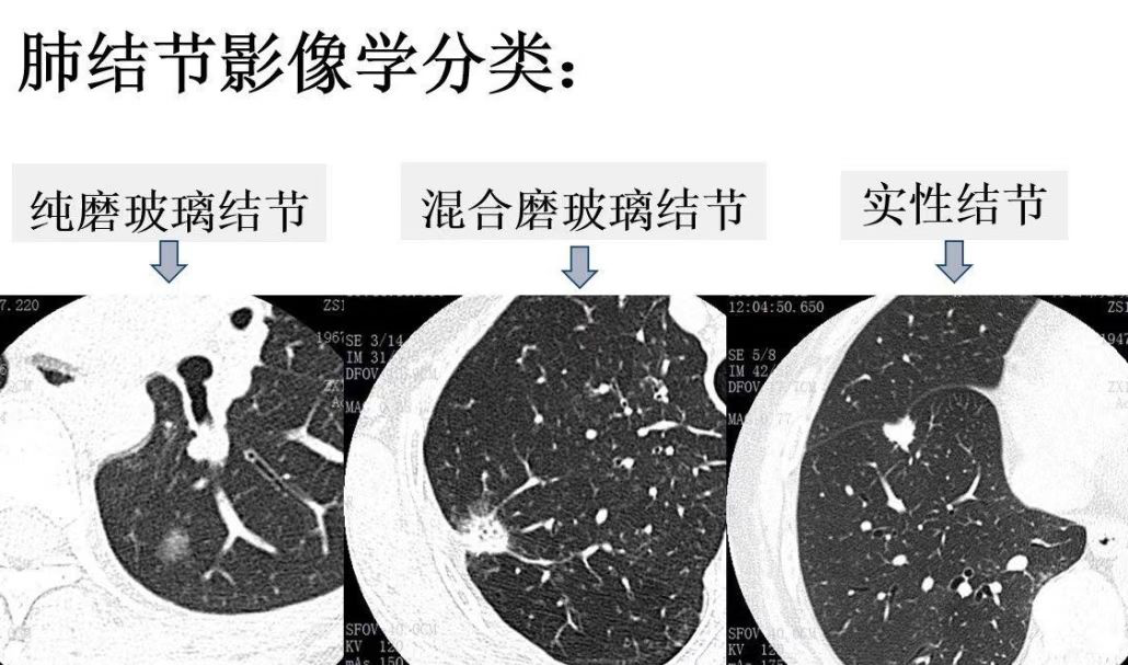肺结节”就是肺组织里的一个小肿块,影像学表现为肺内直径≤3cm局灶性、类圆形、密度增高的实性或亚实性肺部阴影大于3厘米的称肺部肿块。肺结节依其密度不同可分为实性结节、混合磨玻璃结节、纯磨玻璃结节,“打个比方肺相当于水,而上面提到的各种结节分别相当于石头、有石头的沙子、纯沙子。