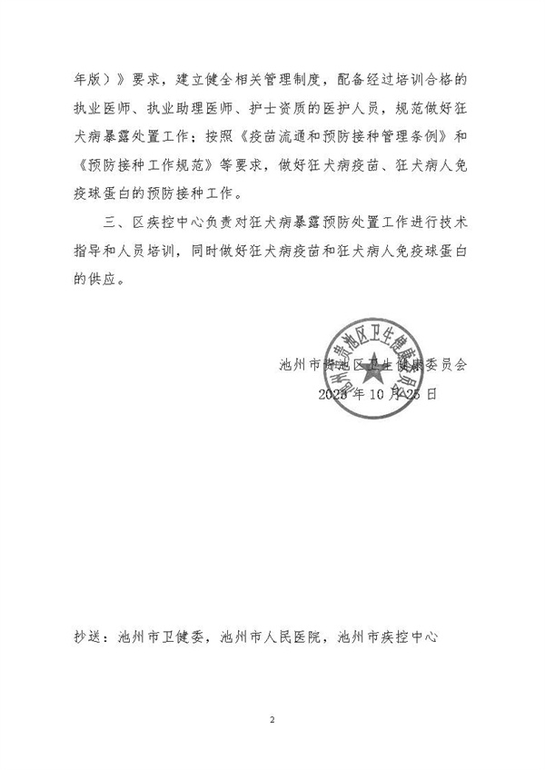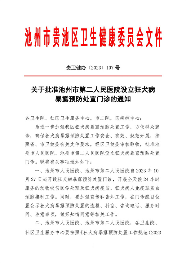 关于批准池州市第二人民医院设立狂犬病暴露预防处置门诊的通知