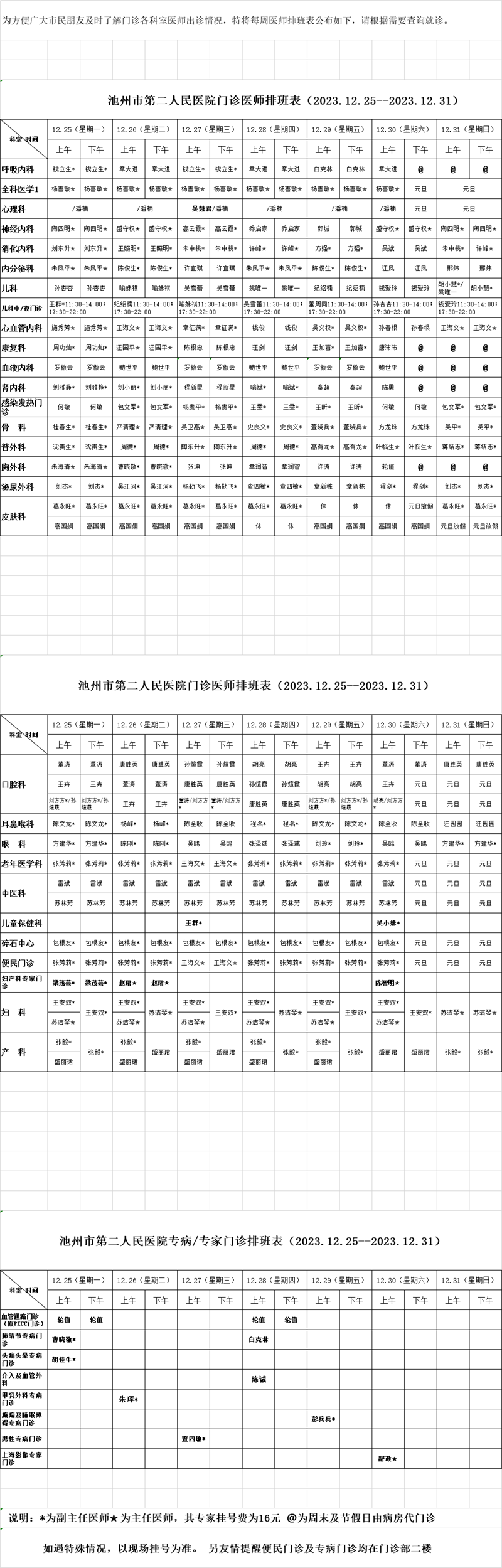 >> 池州市第二人民医院门诊医师排班表(2023.12.25--2023.12.31)
