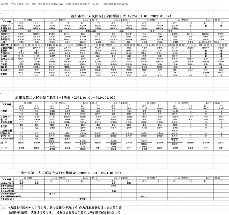 >> 池州市第二人民医院门诊医师排班表(2024.01.01--2024.01.07)