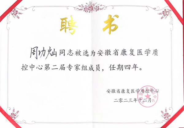 近日,我院康复科周功灿主任获安徽省康复医学质控中心颁发聘书,成为第二届专家组池州地区唯一成员。据悉,安徽省康复医学质控中心全省共58名专家,我院周功灿主任成功入选,充分肯定了我院康复科在池州康复医学所取得的成绩。