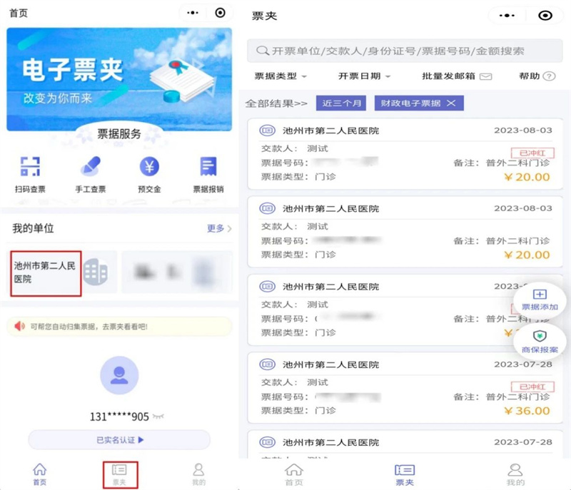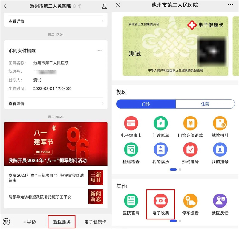 方法一:关注“池州市第二人民医院”微信公众号获取电子票据,具体步骤如下: