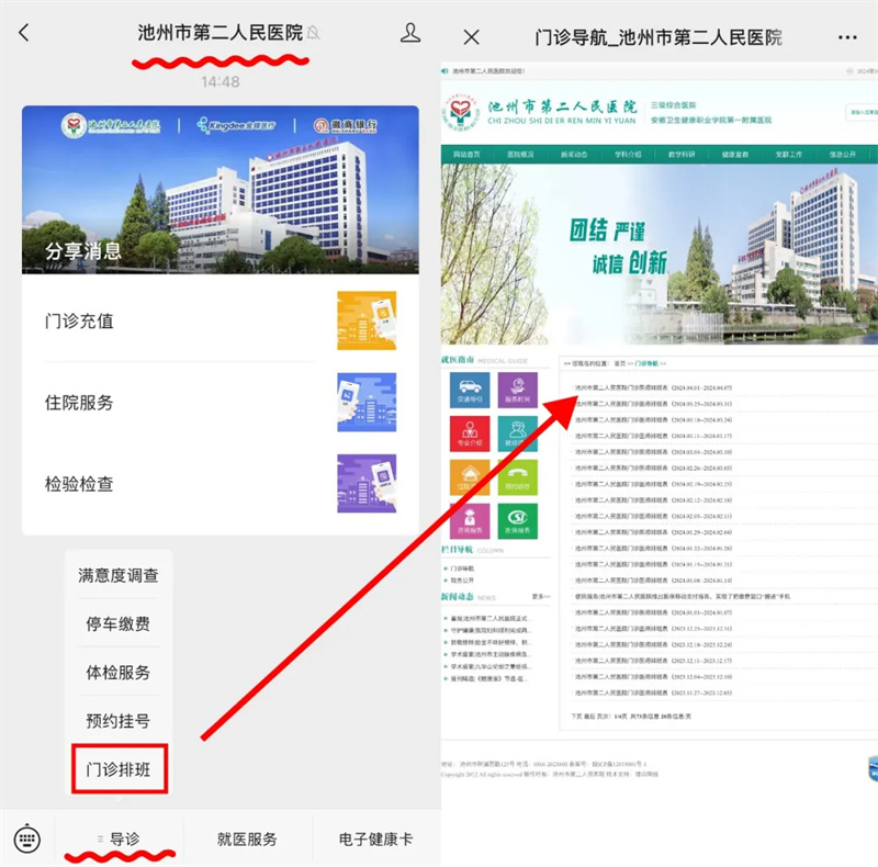 (公众号、医院网站-门诊排班/门诊导航可查询每周排班)