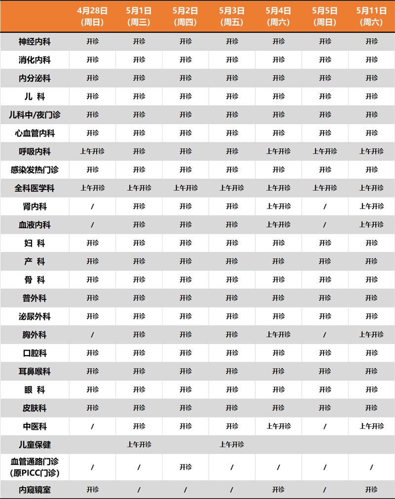 内镜室:4月28日、5月11日正常开诊,5月4日上午开展无痛胃肠镜,下午开展普通肠镜;