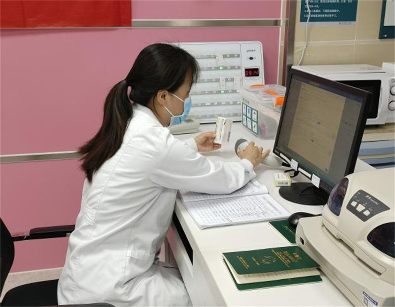 △预防接种工作人员在认真检查及核对每一项疫苗的工作流程,并做好登记记录