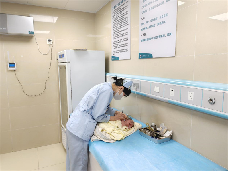 △护士在为新生儿接种首针乙肝疫苗和卡介苗