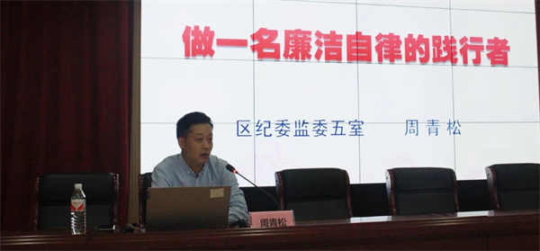 周青松以“做一名廉洁自律的践行者”为题,结合党纪学习教育,从讲规矩、知敬畏、守纪律等方面开展廉政警示教育,并结合身边典型违纪违法案例进行了全面深入的剖析,提醒全体党员干部要以案示警、以案为戒、以案促改,增强大局意识,强化履职担当,守住廉洁初心,筑牢拒腐防变的思想防线。