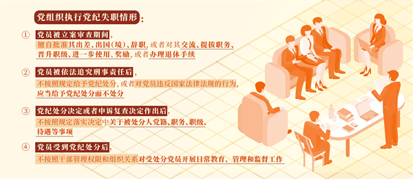 《条例》总则部分规定了对违法犯罪党员的纪律处分,以及执行党纪处分决定的相关要求。《中国共产党纪律检查机关案件检查工作条例》规定了党员被立案审查期间,党组织不得擅自批准的事项。中央纪委、中央组织部等关于受党纪处分的党政机关工作人员年度考核有关问题的相关文件,对有关考核等次作了规定。党组织要认真落实这些规定,严格执行党的纪律,真正发挥党纪的刚性约束作用。