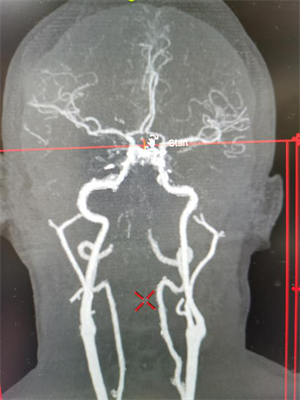 经快速沟通,家属签字同意后,静脉溶栓药物开始使用,同时病情报告给神经内科脑血管介入团队,在保持呼吸道通畅等措施下进行急诊CTA检查,在静脉溶栓药物使用结束时,患者的CTA检查结果出来,证实是急性脑梗死,基底动脉闭塞。与患者家属沟通颅内动脉取栓风险与获益,家属同意手术。