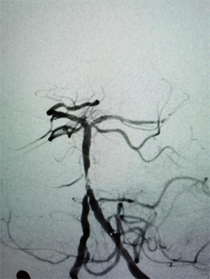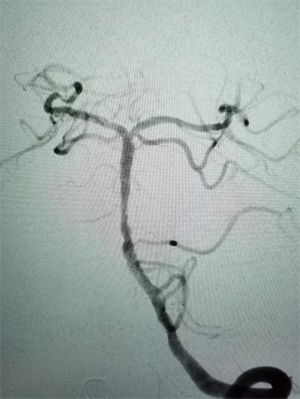 在麻醉科及脑血管介入团队的积极配合下,15:35股动脉穿刺成功,造影发现基底动脉闭塞,经导管抽吸取出血栓一枚,15:56血管再通,复查造影显示基底动脉中下段重度狭窄,后在狭窄段置入血管支架一枚。手术顺利,当晚患者神志转清醒。