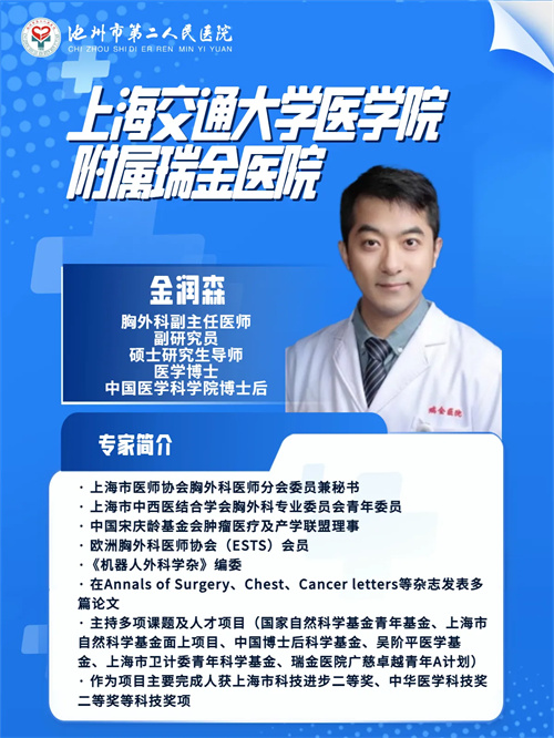 本周六,上海交通大学医学院附属瑞金医院胸外科专家金润森来院坐诊、手术