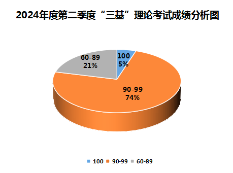 本次“三基”理论考试内容为各专业基础理论知识,考题为100道单项选择题,及格分为60分,考试达标率100%,优秀率79 %(≥90分)。(附考试结果分析图)