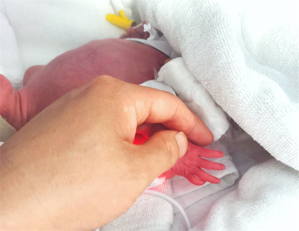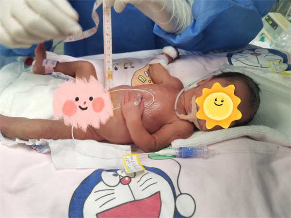 然而,这也是我院产科联合新生儿科重症监护室医护团队成功救治的一名早产儿刚出生时的体重。两个月前,一位孕29+5周的孕妇急诊入院,产科医生评估发现已早产临产即将分娩,且合并胎儿宫内发育迟缓,羊水过少。立即启动危急孕产妇救治预案,并紧急联系新生儿科值班医生赶至产房,同时做好早产新生儿复苏抢救准备。胎儿娩出后无哭声、无自主呼吸,全身紫绀,四肢软,心跳极微弱,由于存在严重的出生窒息,柔弱的小生命危在旦夕,情况异常凶险。产科及新生儿科救治团队紧密协作,密切配合,经过高质量的新生儿复苏,自主呼吸恢复,心率及血氧饱和度恢复正常。抢救复苏成功后立即转入新生儿科重症监护病房,新生儿科迅速成立救治小组,同时制定了详尽的救治方案。