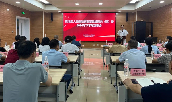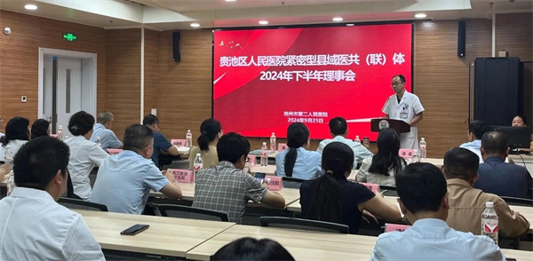 2024 年 9 月 25 日,贵池区人民医院紧密型县域医共(联)体2024年下半年理事会会议在我院召开。区卫健委相关领导、院领导班子成员、各职能科长以及各医共体成员单位负责人等50余人参加了会议,会议由朱珲院长主持。
