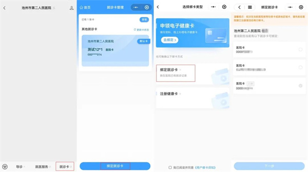 2、就诊卡遗失可线上绑卡:关注我院公众号,点击“就诊卡”,按提示填写信息完成绑卡后,前往我院门诊收费窗口展示绑卡生成的二维码办理退款。