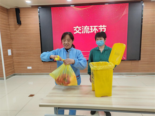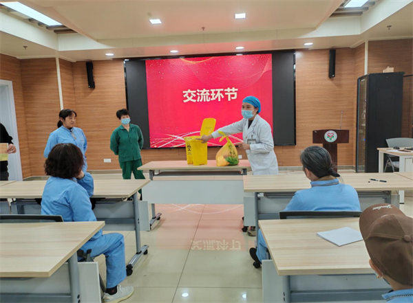 培训结束后,交流座谈会随机展开。工勤人员结合自身岗位实际,踊跃发言。保洁人员分享了在病房医废收集处置过程中,如何规范封扎袋口,避免医废渗漏遗撒;运送人员则提出了在转运患者和医疗废物时遇到的职业暴露风险等问题。针对这些问题,大家共同探讨解决方案,院感科、总务科和物业的工作人员认真倾听,及时给予专业的指导和建议。