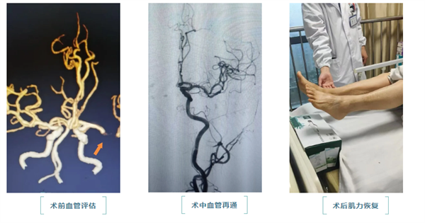 4月17日,84岁女性患者突发右侧肢体完全瘫痪,有房颤病史。11:20发病,12:20抵院后,卒中绿色通道即刻启动,急诊团队仅用13分钟内完成病史采集、NIHSS评分及溶栓评估,于13:00精准实施静脉溶栓,从入院到用药仅40分钟(DNT)。并紧急无缝衔接完成 CTA 评估,确诊左侧大脑中动脉闭塞。卒中中心介入团队迅速开展桥接颅内取栓术,仅抽吸一次便成功开通血管。手术开始至血管再通仅30分钟,术后患者肢体功能恢复良好,现已能在协助下下床活动。