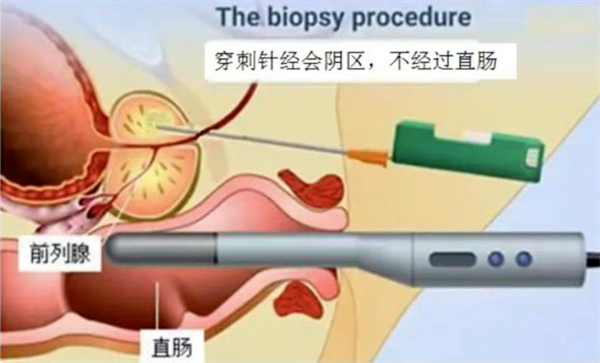 经会阴穿刺活检是穿刺针通过肛门和阴囊之间的皮肤区域穿入前列腺组织从而获取标本。