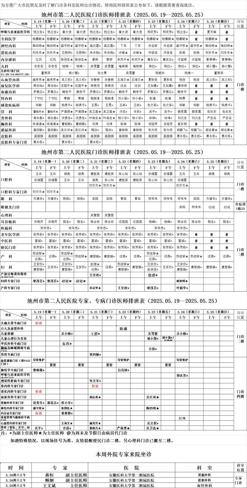 >> 池州市第二人民医院门诊医师排班表(2025.05.19--2025.05.25)