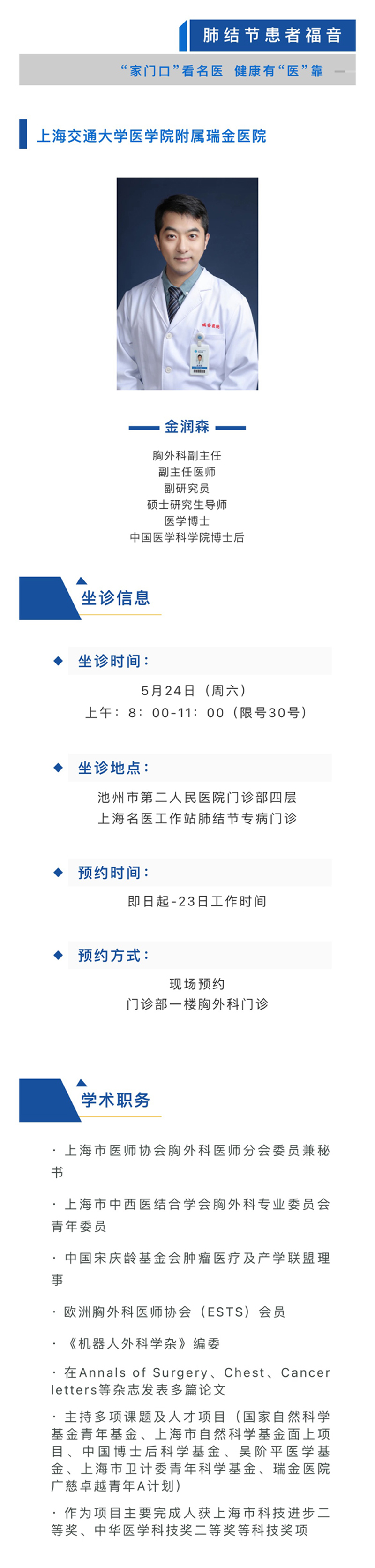 >> 关注!5月24日,上海交通大学医学院附属瑞金医院胸外科金润森教授来院坐诊、手术
