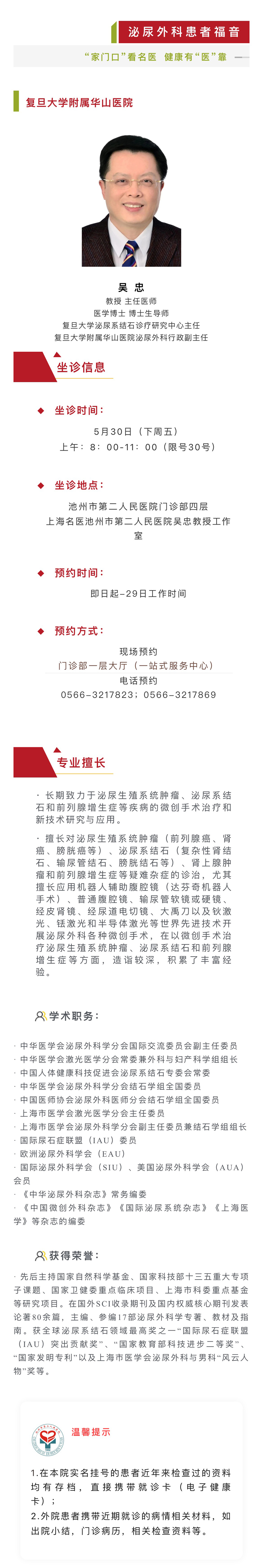 关注!5月30日,复旦大学附属华山医院泌尿外科吴忠教授来院坐诊