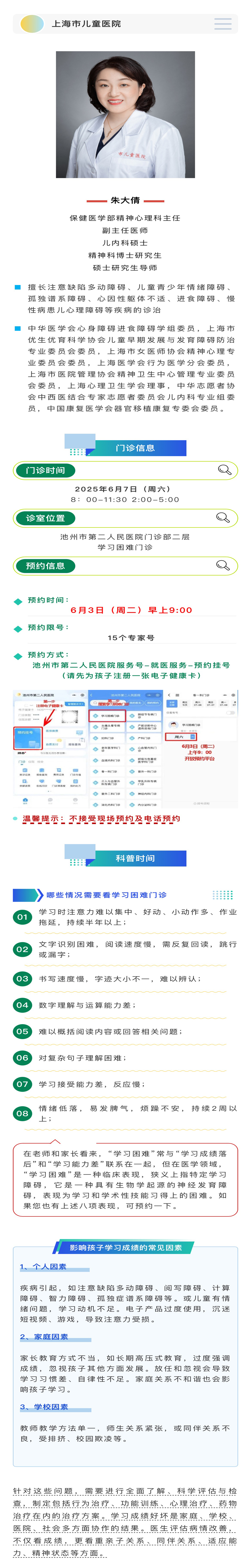 关注!6月7日,上海市儿童医院朱大倩主任坐诊学习困难门诊
