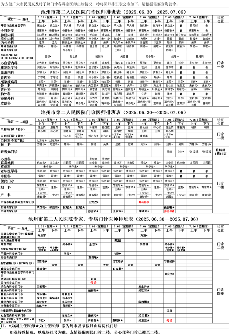 >> 池州市第二人民医院门诊医师排班表(2025.06.30--2025.07.06)